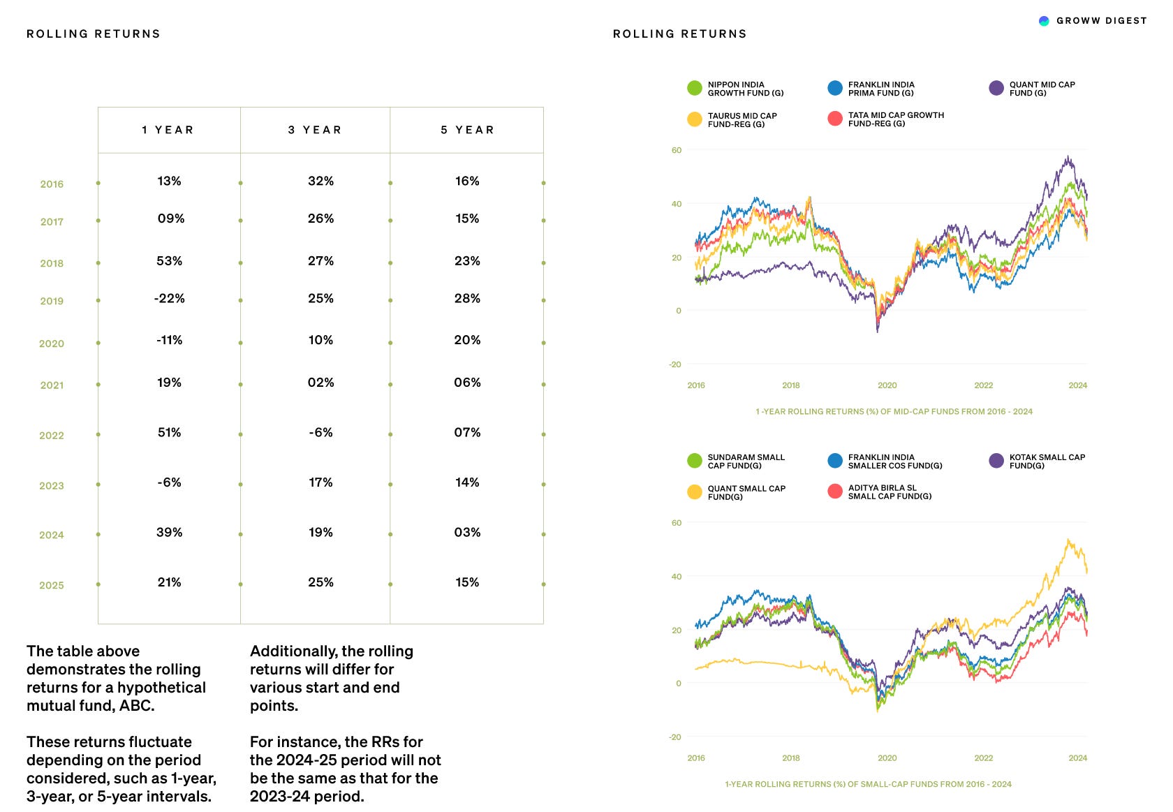 To understand these gaps, we checked the rolling returns of small-cap and mid-cap funds from 2016 to 2024.