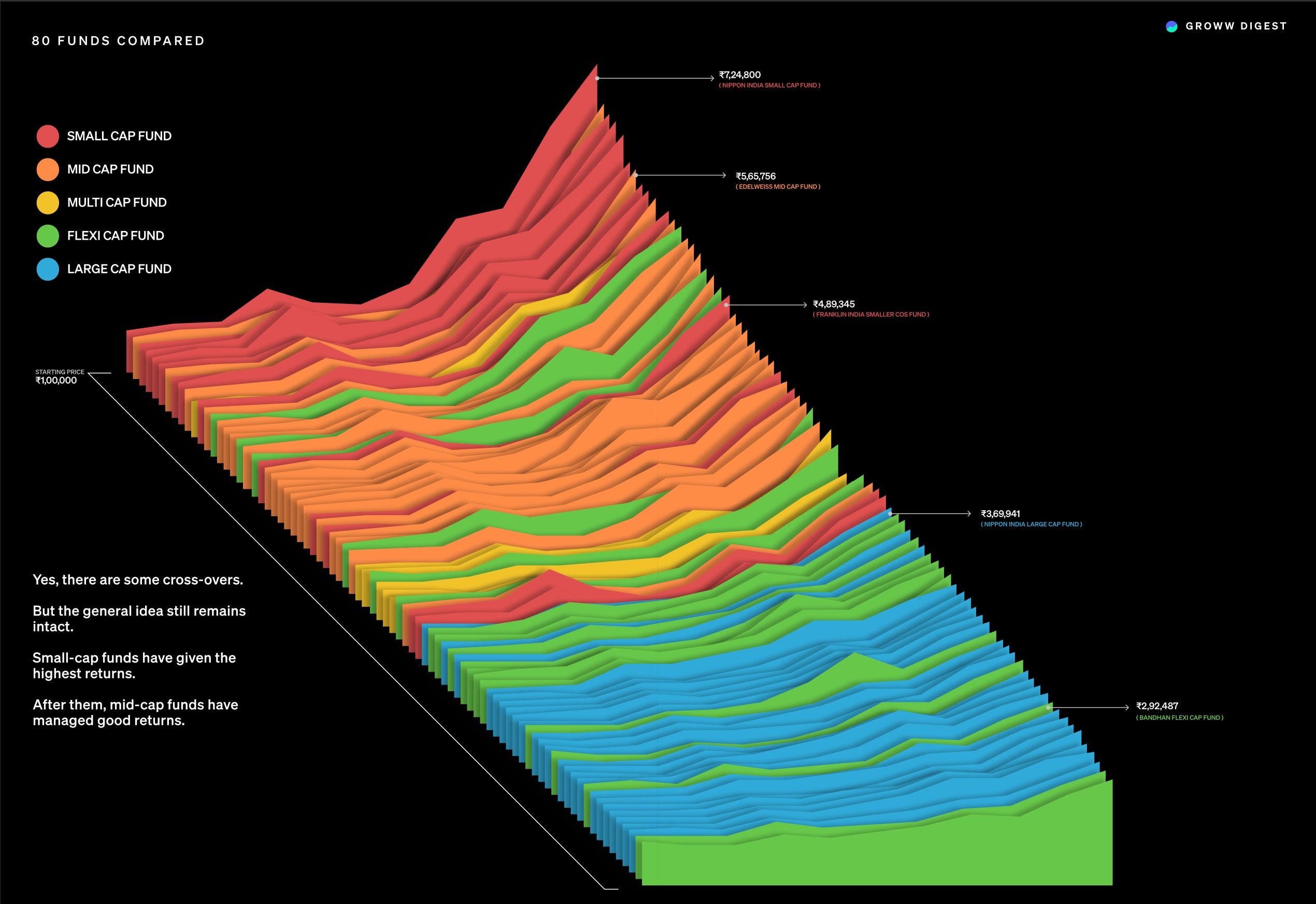 So we took that Rs 1 lakh example and applied it to different categories of mutual funds: small-cap funds, large-cap funds, mid-caps, flexi-caps, multi caps.