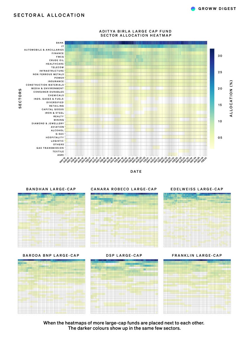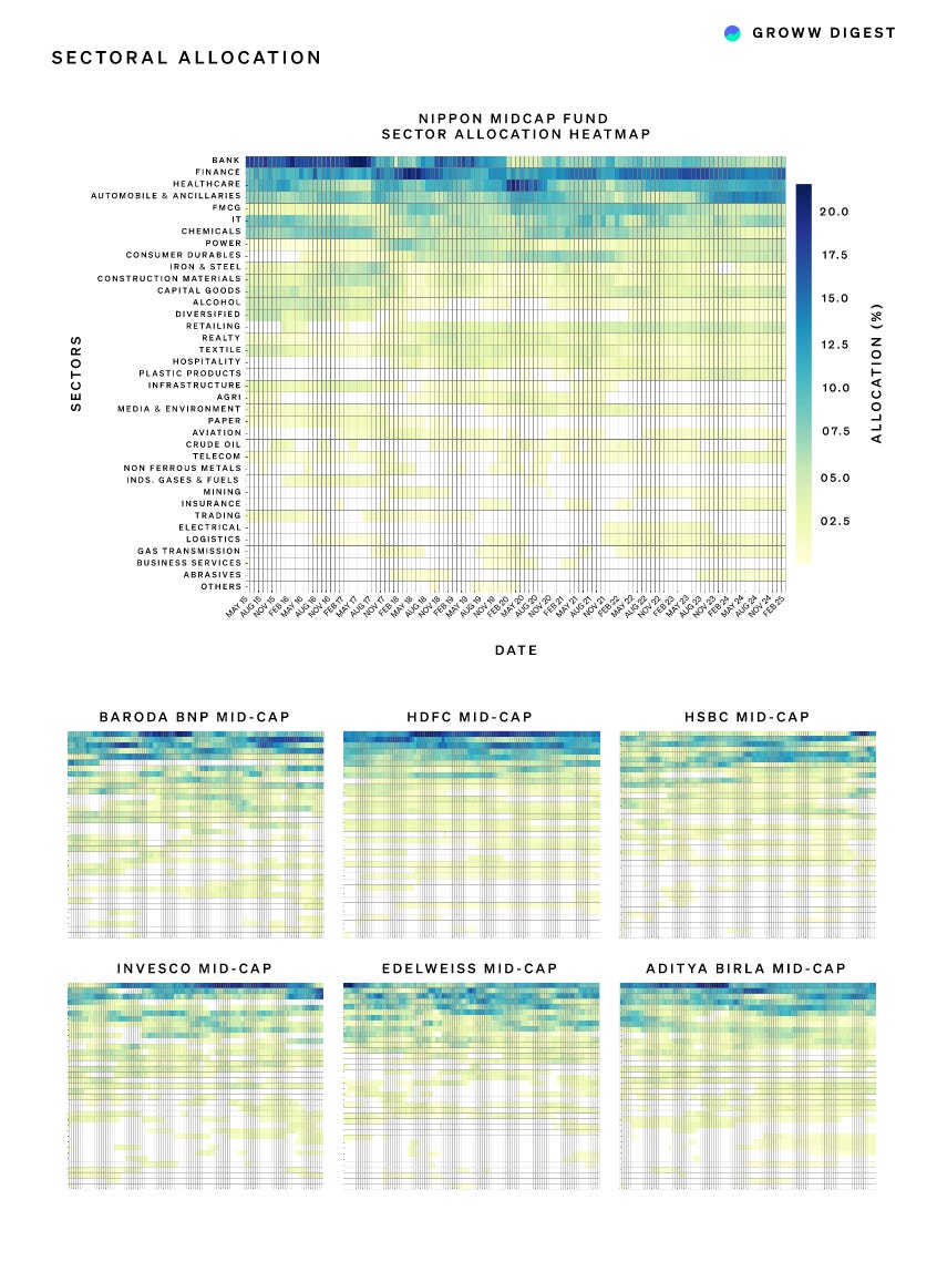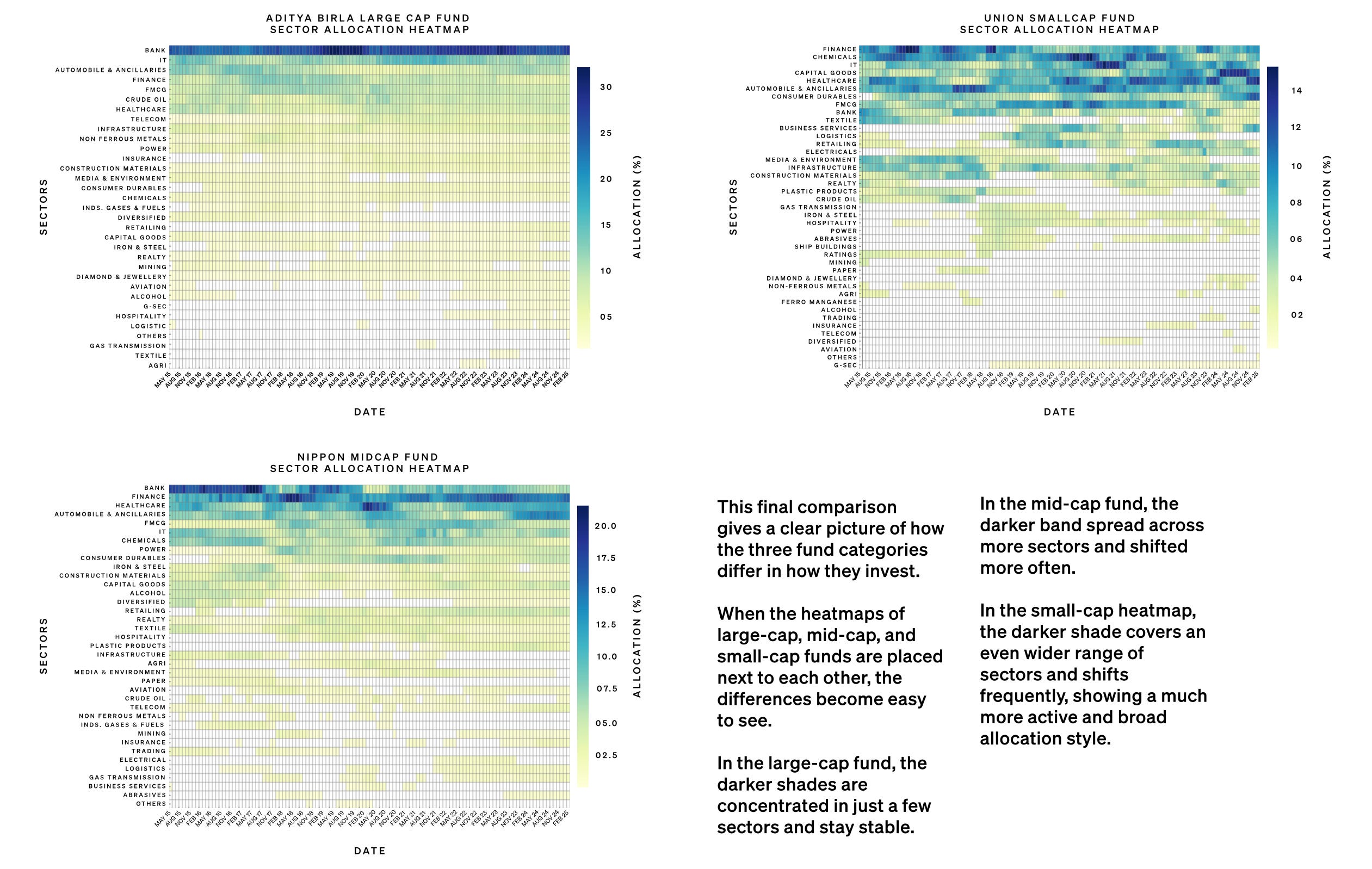 Notice how in the heat-maps of large-cap funds, the blue-bank was almost always in the finance sector across nearly all large-cap funds; but in case of mid-cap funds, there is no clear industry that is chosen by all mid-cap funds.