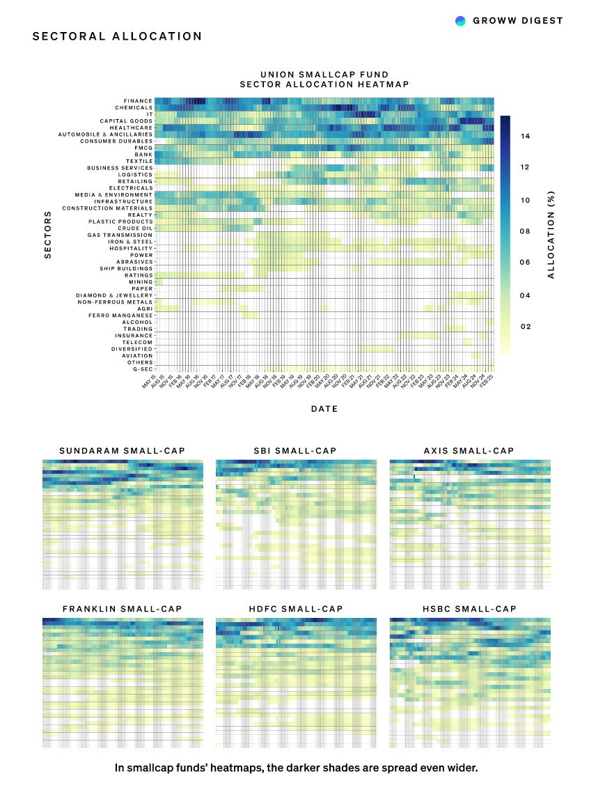 These funds invest in a wider range of sectors. The darker shade in the heat map can be seen spread across many more sectors compared to mid-cap and large-cap funds, including many that are not commonly seen in large-cap or mid-cap funds’ portfolios.