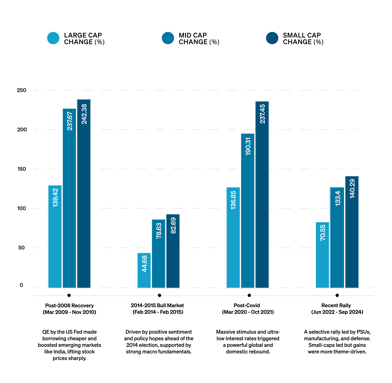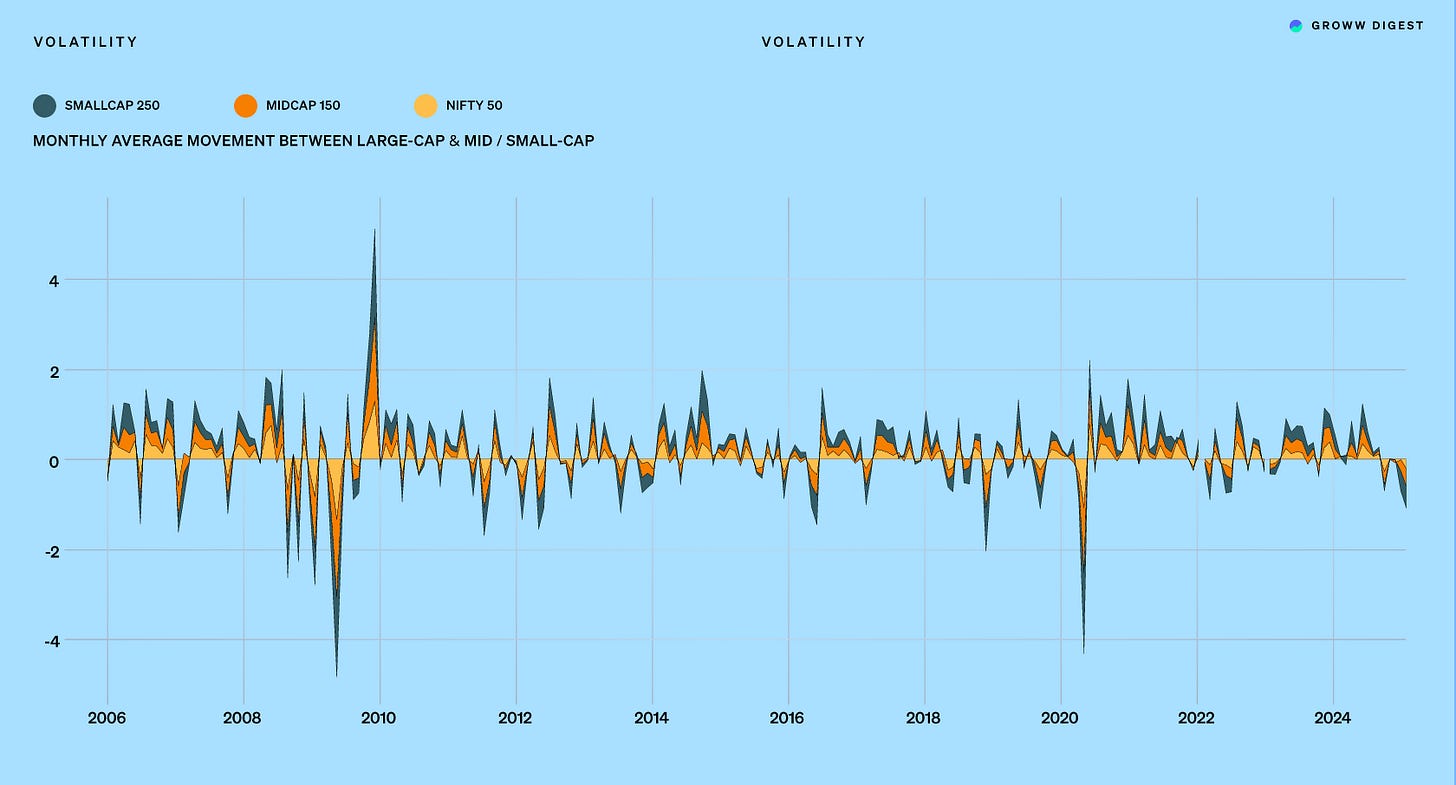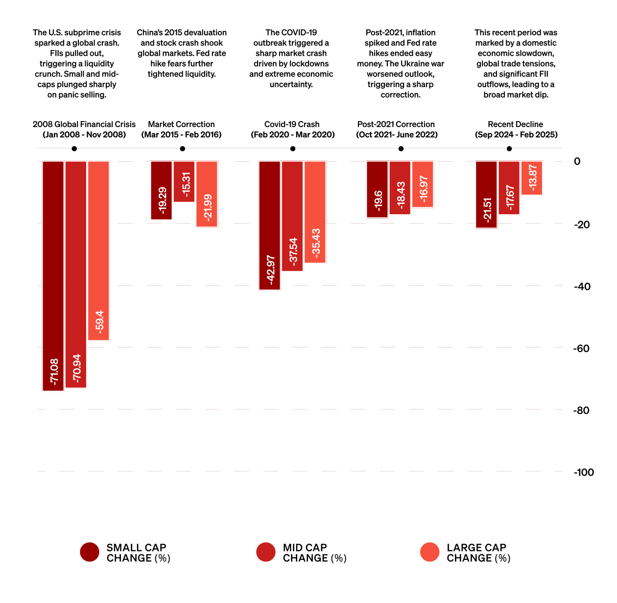 Big market crashes and the recoveries show the actual difference between large-cap, mid-cap, and small-cap funds. Because they don't only fall in different ways, they also bounce back differently.
