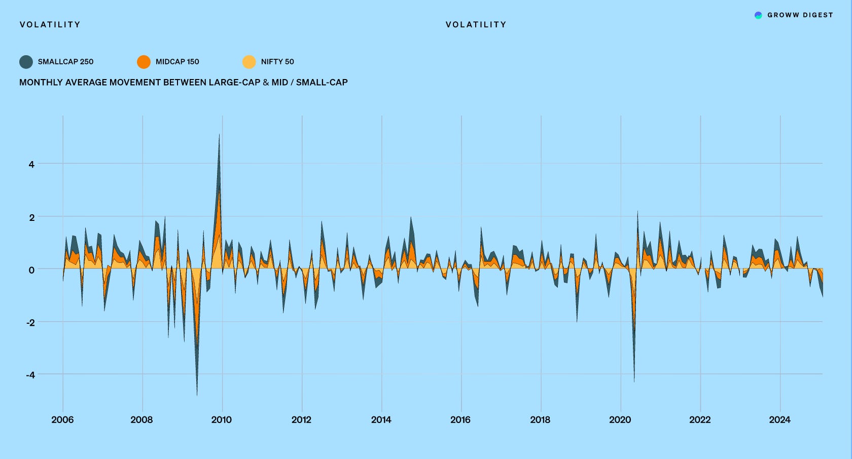 Mid-caps come somewhere in between. Large-caps, on the other hand, are more stable. Their movements are milder both up and down.