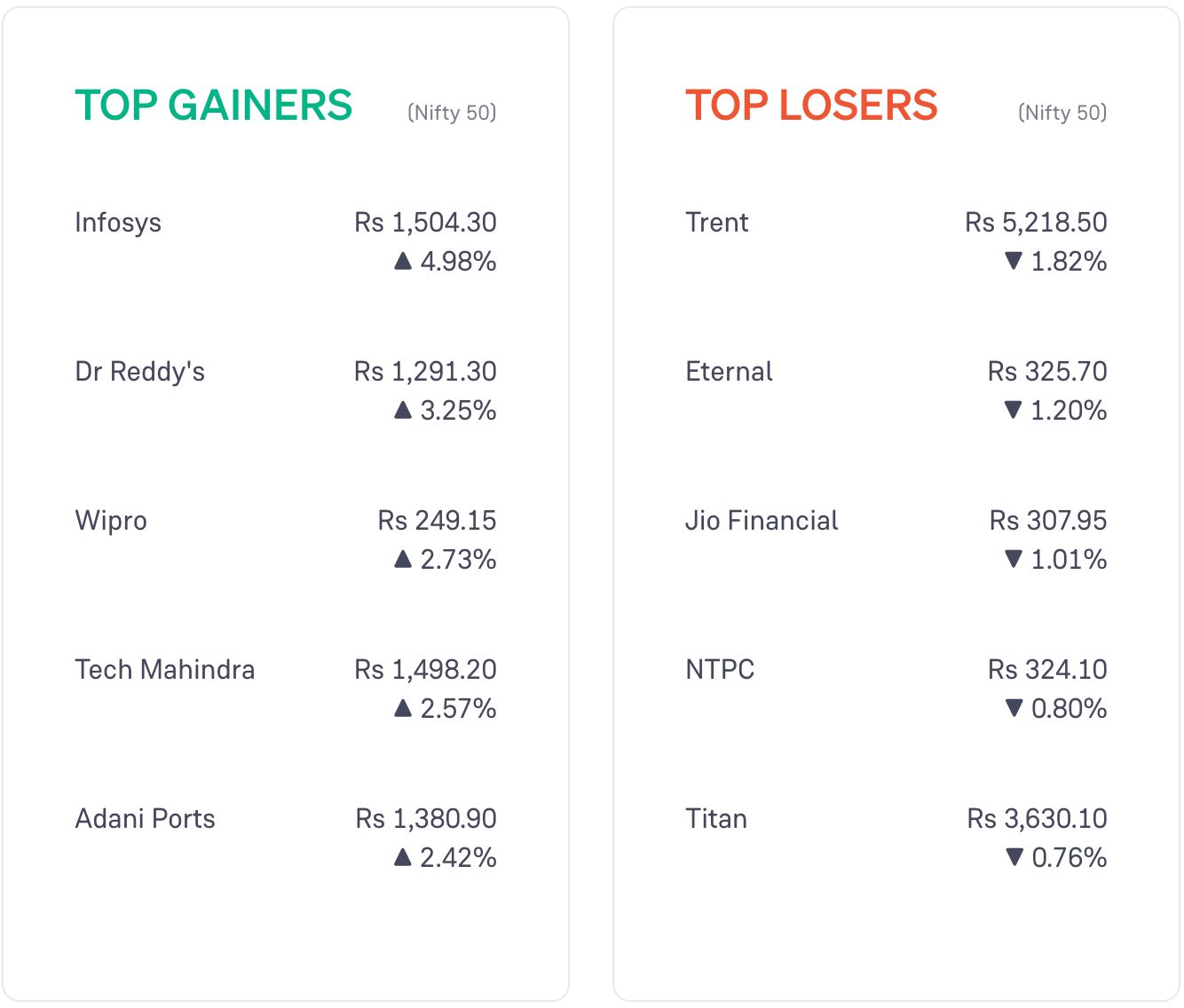 IT stocks and pharma stocks rose the most today. Realty stocks and oil and gas stocks fell the most.