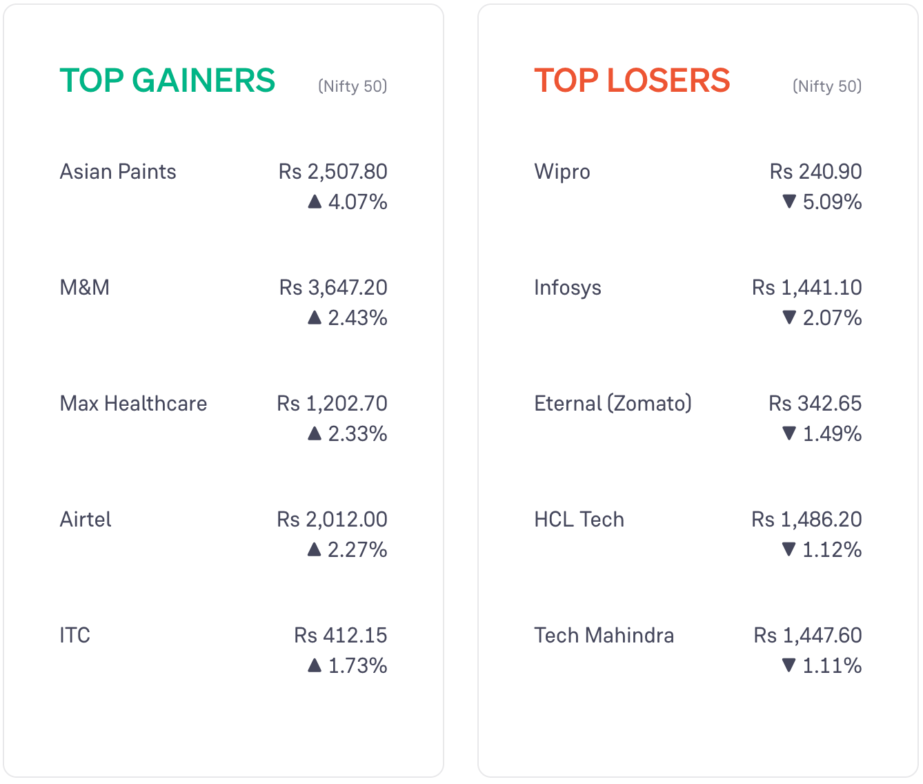 FMCG stocks and healthcare stocks rose the most today. IT stocks and media stocks fell the most.