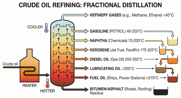 Broadly speaking, the products are LPG and other gases, petrol, naphtha, kerosene, diesel, bunker fuel, lubricating oil, asphalt, and a few more.