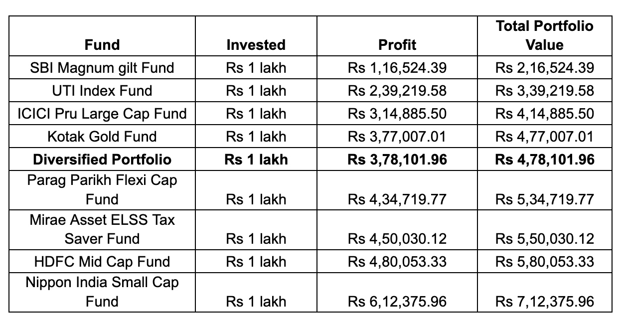 The experiment was structured in three parts: returns from each mutual fund individually, a fully diversified portfolio where the Rs 1 lakh was split equally across all 8 funds and a comparison with alternative outcomes.