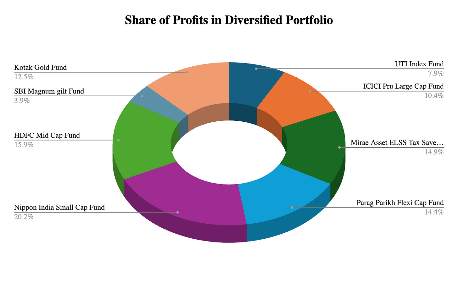 In this portfolio too, the small-cap, mid-cap, ELSS fund and the flexi-cap fund pulled the most weight by having the most share in profits.
