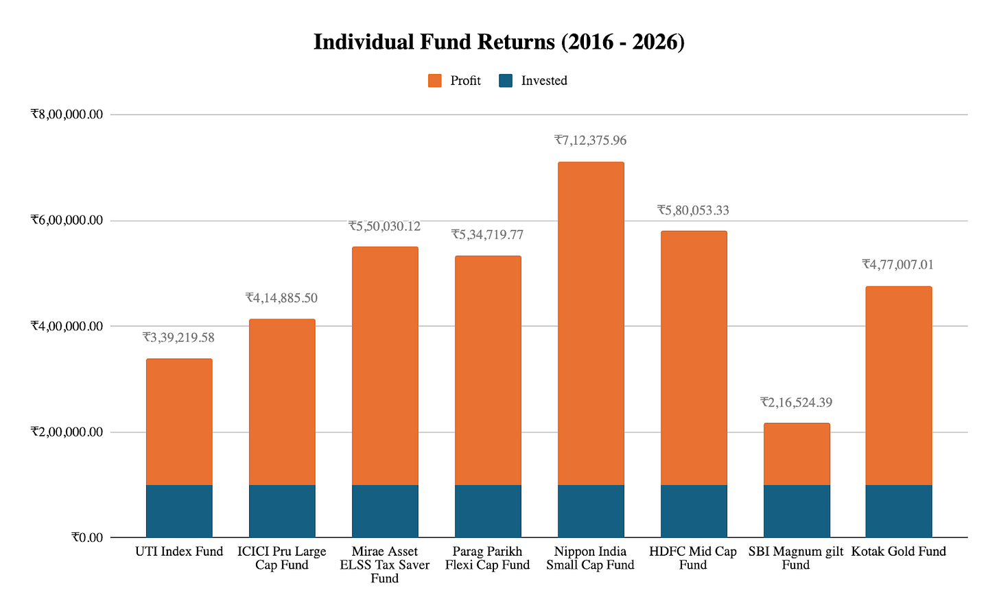 The goal was to see how the same amount of Rs 1 lakh would behave over the period from 2016 to 2026 when managed under different portfolios.