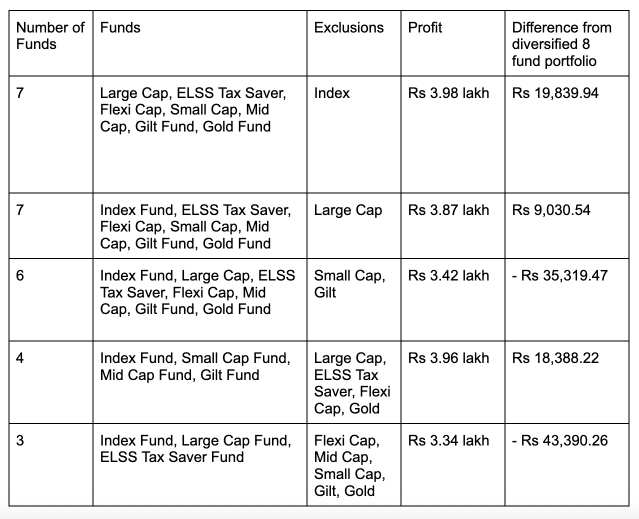 In fact, certain combinations (such as when large-cap, index, and ELSS funds were grouped together) showed that maintaining similar risk exposure (all equity) while reducing the number of funds did not necessarily lead to better outcomes.