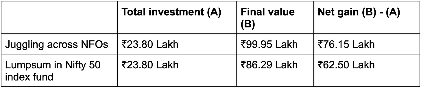 In this simulation, we have considered all NFOs of ‘active large-cap funds’ since 2006.