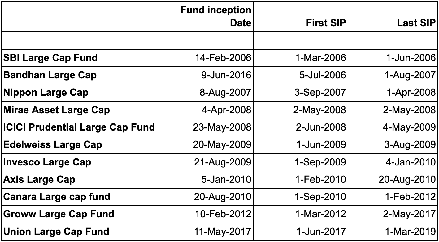 The dates for SIP investments sometimes differed slightly by a few days between the index and active funds. This is because the Ace MF system, the data sourcing tool we used, occasionally omitted certain NAV dates for some of the funds.