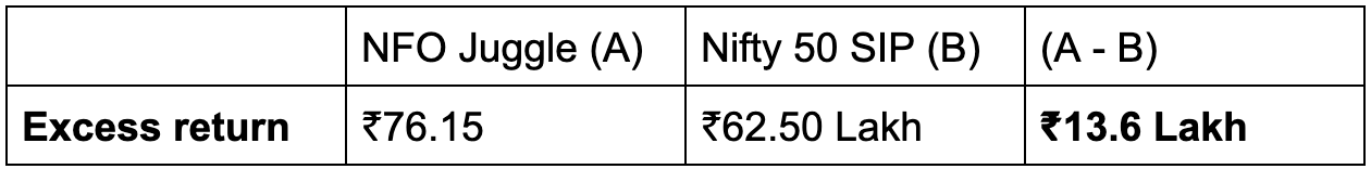 So juggling across active large cap funds generated an additional return of Rs 13.6 Lakh.