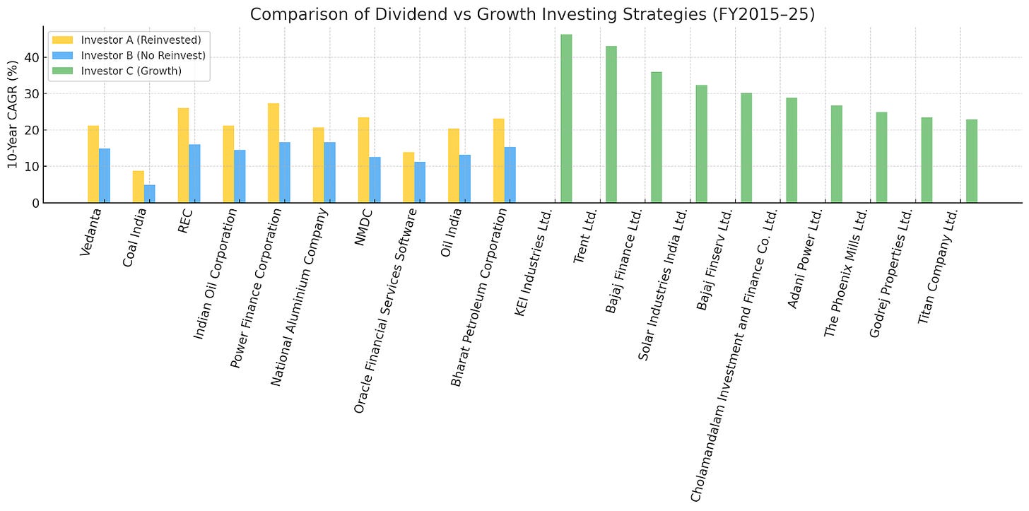 Coal India dropped from 8.8% (reinvested) to barely 5% when dividends weren’t reinvested.
