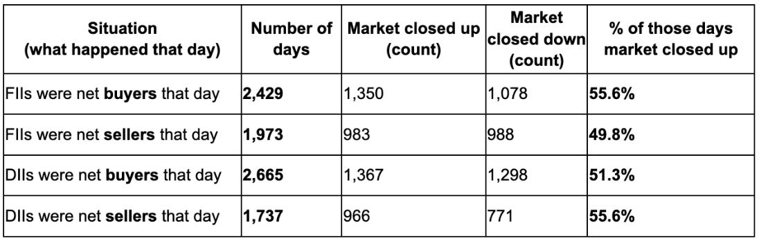 The table below shows what tended to happen when FIIs or DIIs were buyers or sellers on a given day.
