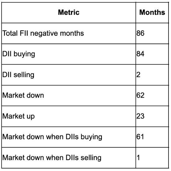 When FIIs were net sellers for the month, DIIs bought in 84 out of 86 months. That means domestic institutions almost always step in when foreign investors sell.