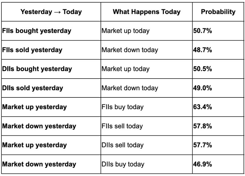 The highest number in the table is 63%. This means that after the market rises, FIIs buy the next day about 6 out of 10 times. That shows a tendency, but it is far from a reliable rule. In roughly 4 out of 10 cases, the opposite still happens.