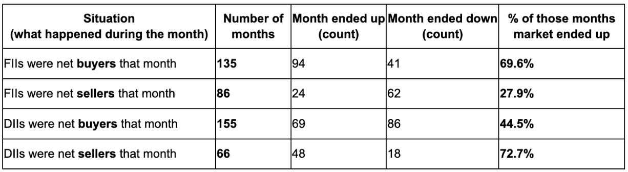 When FIIs were net sellers for the month, the market ended lower about 72% of the time.