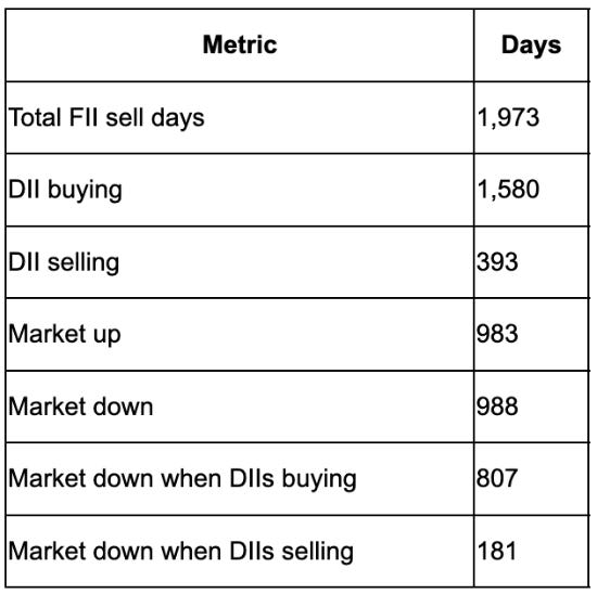 On the 1,973 days when FIIs sold, DIIs bought on 1,580 days.