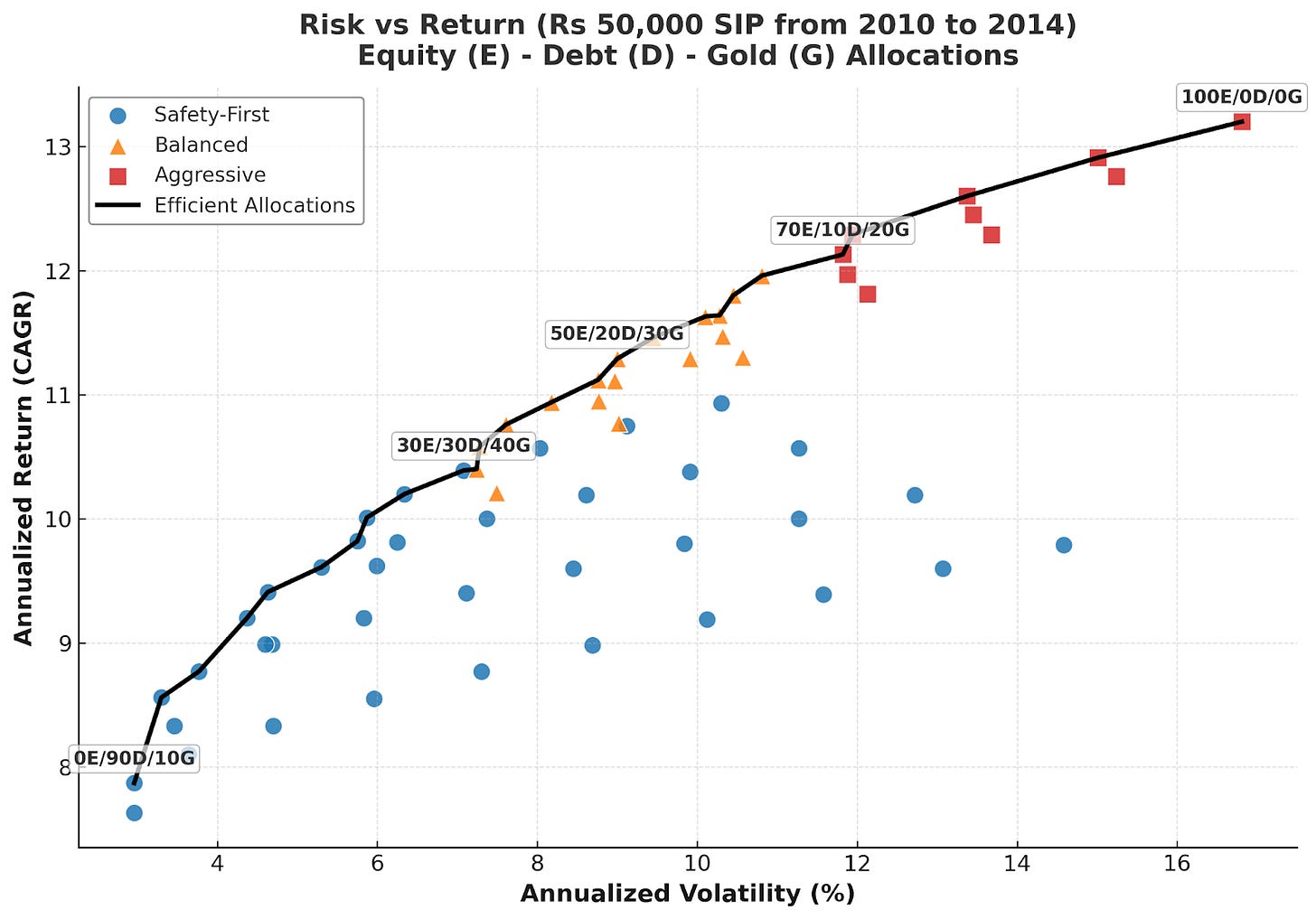 As you can see from the above graph, some of the safety-first portfolios turned out to be outliers. These were the gold-heavy allocations with very little equity or debt. While they technically fall under ‘low equity’, their returns were far more volatile than debt-heavy mixes. This shows that not every low-equity portfolio is automatically stable. Gold-heavy ones behave very differently. So while you can include gold in your portfolio to diversify, it can also lead to higher volatility. On the other hand, if you use debt to diversify, it can lead to very low returns.