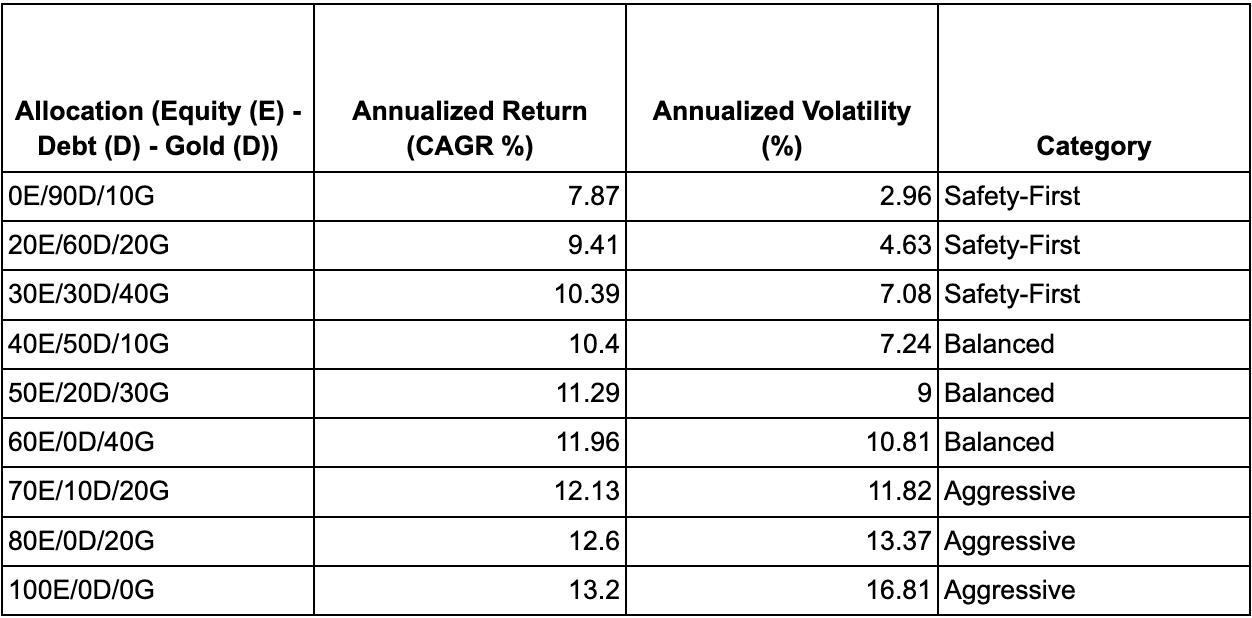 To keep it simple and easy to understand, we took allocation percentages in multiples of 10, and we found 66 such iterations (including allocations where equity is 100/0% or debt is 100/0% or gold is 100/0%).