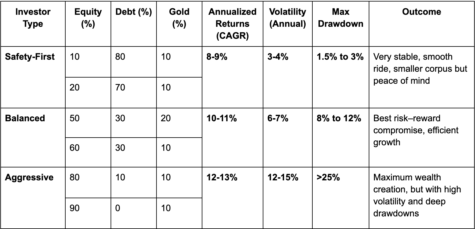 On the aggressive side, equity-dominated portfolios like 80% Equity + 10% Debt + 10% Gold and 90% Equity + 0% Debt + 10% Gold topped the charts with 12-13% annualized returns. The final corpus easily crossed Rs 2.4 crore against an investment of Rs 90 lakh. But this came at the cost of much higher volatility (12-15%) and deep drawdowns of 25% or more. These are the wealth-maximizing paths, but only suited for investors who can stomach large swings and stay invested through the rough patches.