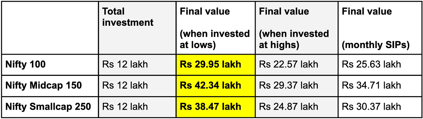 This means we hypothetically invested all of Rs 1.2 lakh for the day when the market touched its lowest in the year.