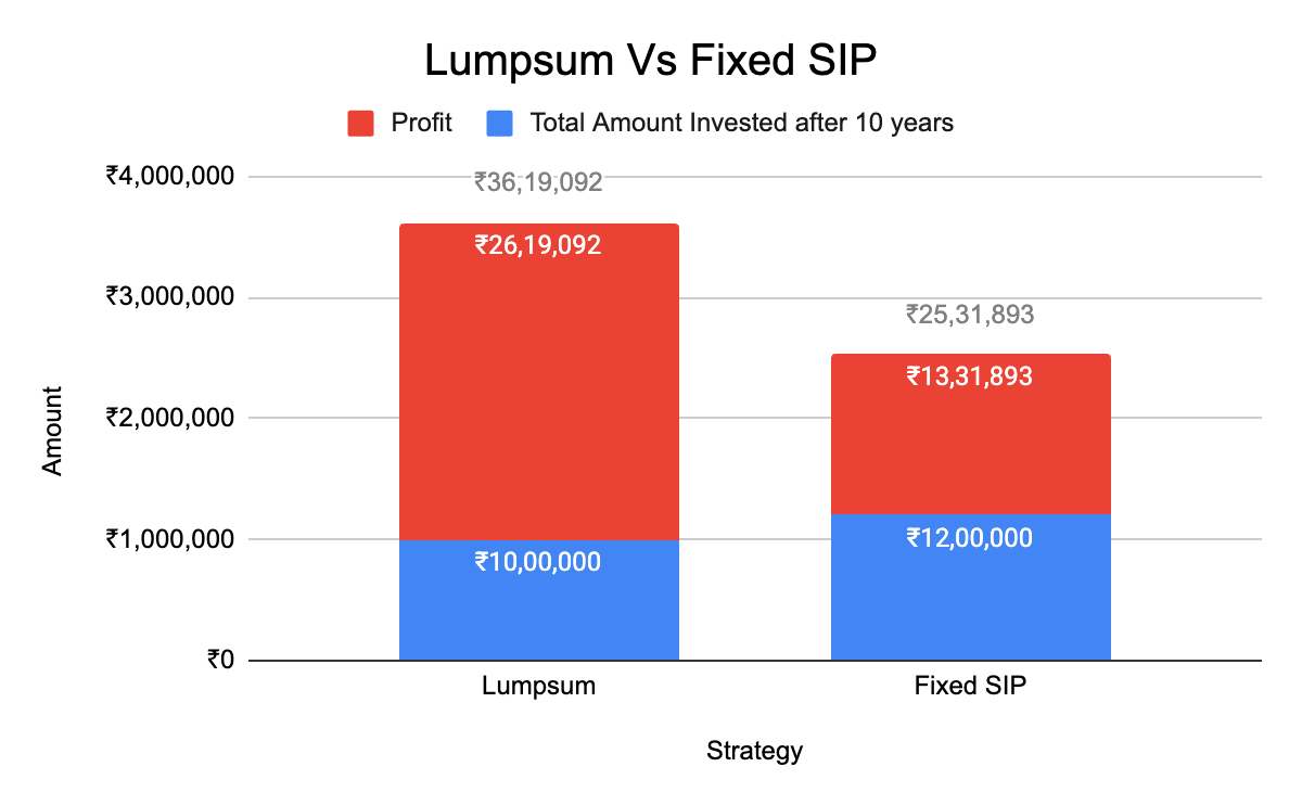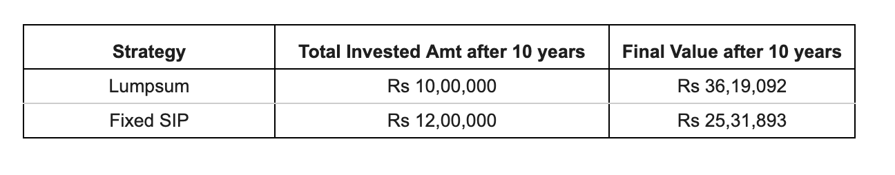 For the lumpsum investor every rupee compounds for the full 10 years.
