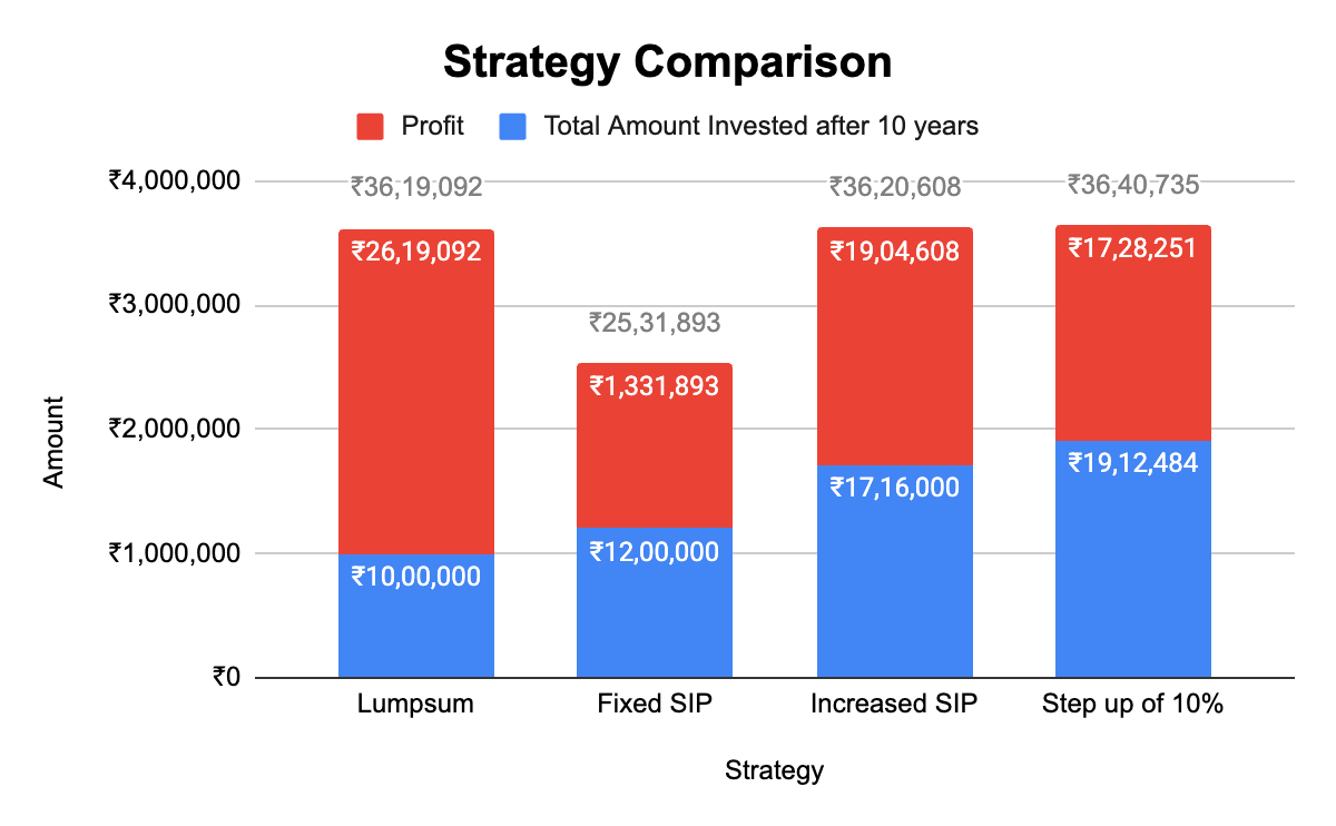 The increased SIP of Rs 14,300 or a 10% step up every year will eventually match or even beat the Rs 10 Lakh lumpsum investment.