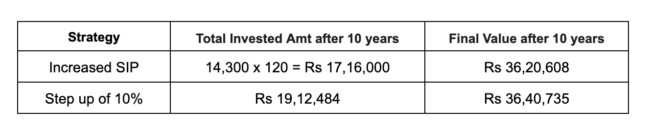 The Increased SIP: Start with a higher SIP amount of Rs 14,300 and keep it constant over the 10 years.