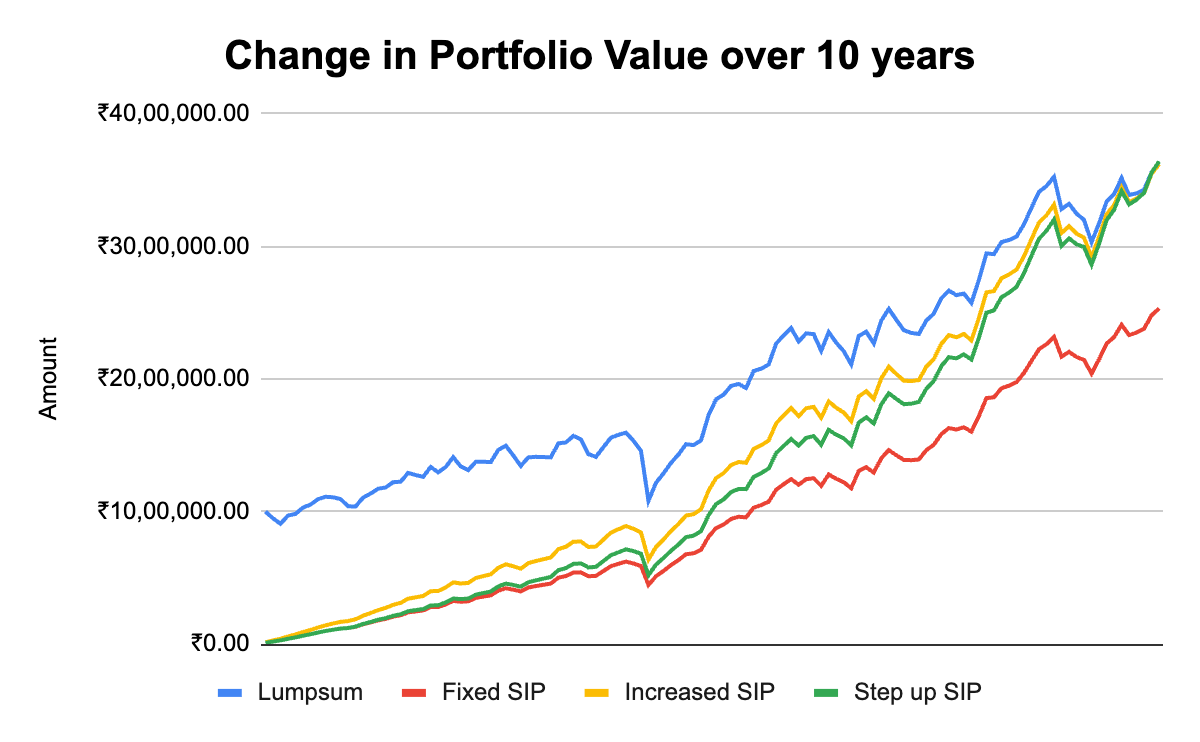 This means to generate the same wealth as the lumpsum investor, the SIP investor has to step up the money invested.