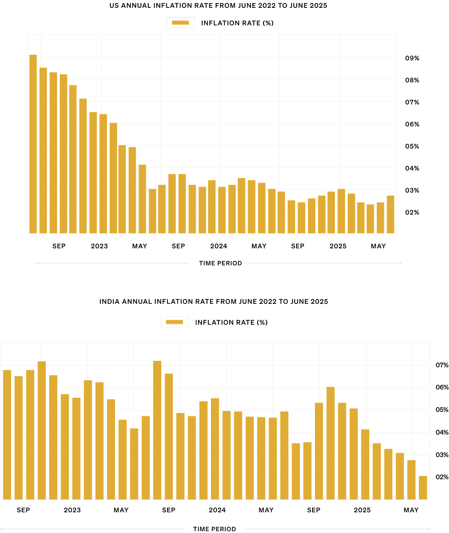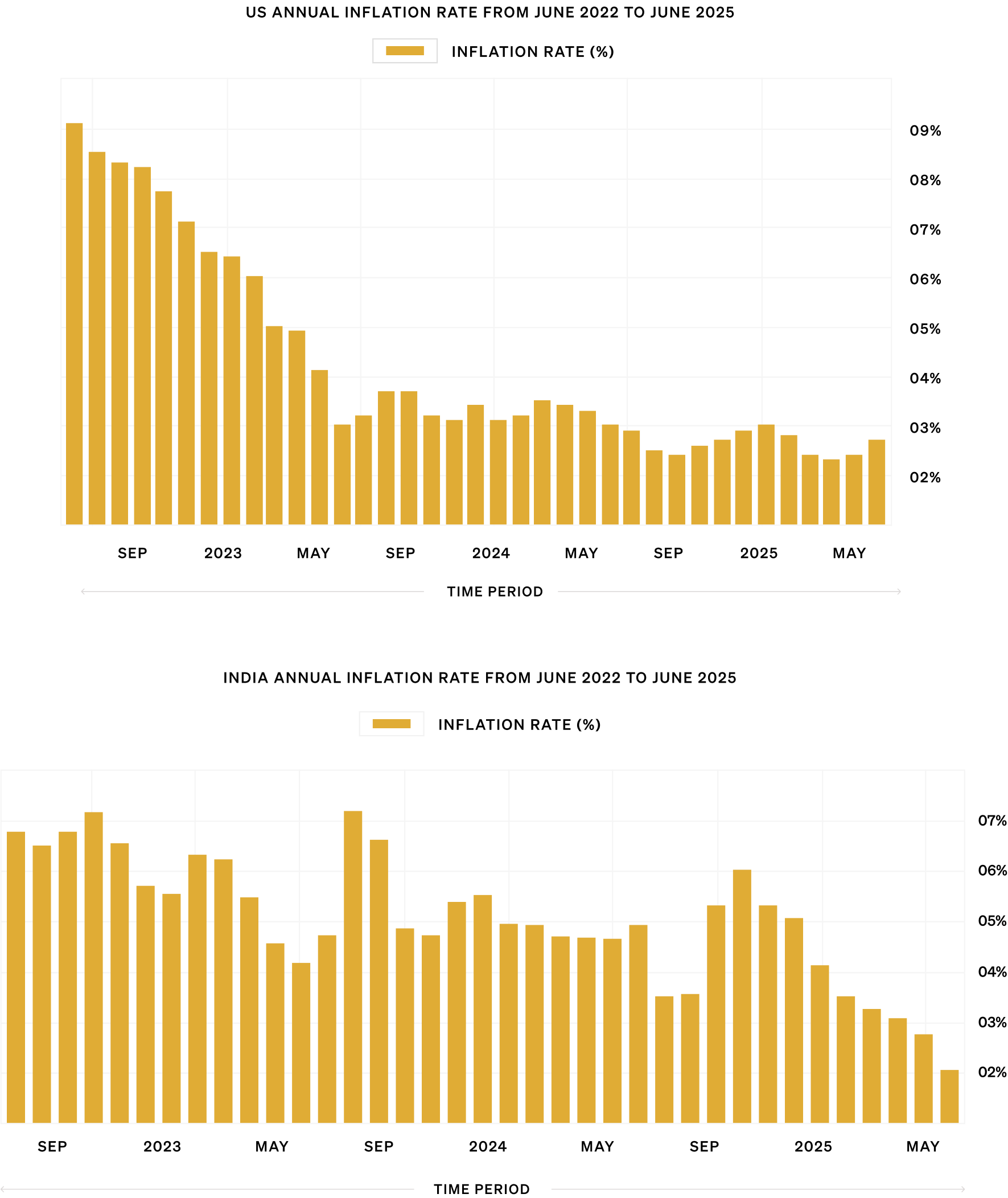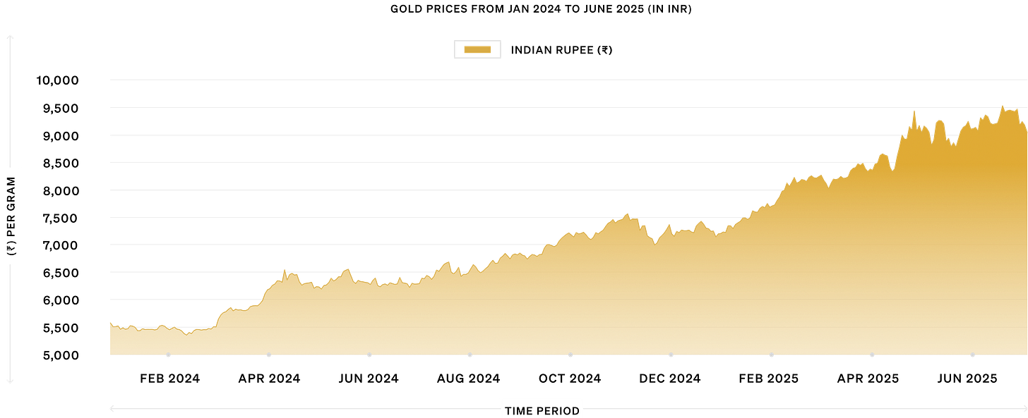 Inflationary Pressures: Persistent inflation rates, with core inflation hovering around 2.8%, sustained high demand for gold. Investors view gold as a reliable hedge against the reducing purchasing power caused by inflation. In the Indian markets, while the inflation rates went down in the first half of 2025, they remained at a higher scale for the almost the entire 2024.