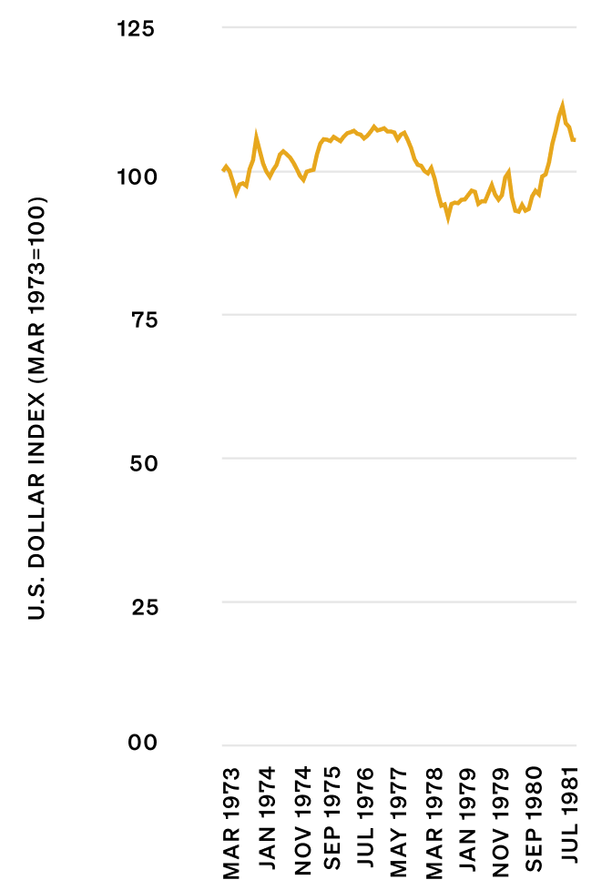 By the late 1970s, the U.S. dollar had weakened dramatically. The combination of high inflation, two oil shocks, and the end of the gold standard had shaken faith in the currency