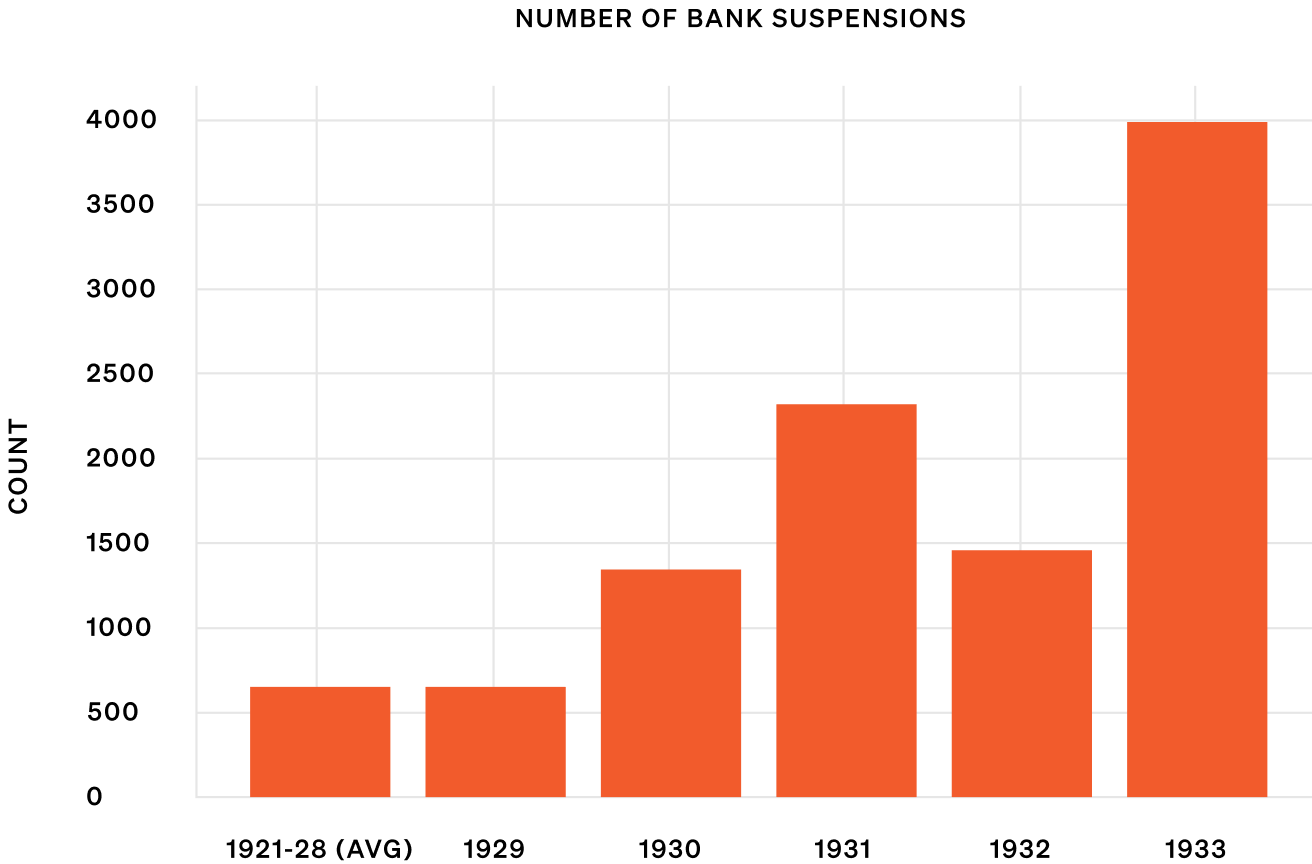 This growing distrust in the financial system led to a banking crisis, with nearly 9,000 out of 25,000 U.S. banks failing between 1930 and 1933. As the banking system collapsed and deflation deepened, the gold standard became unsustainable.