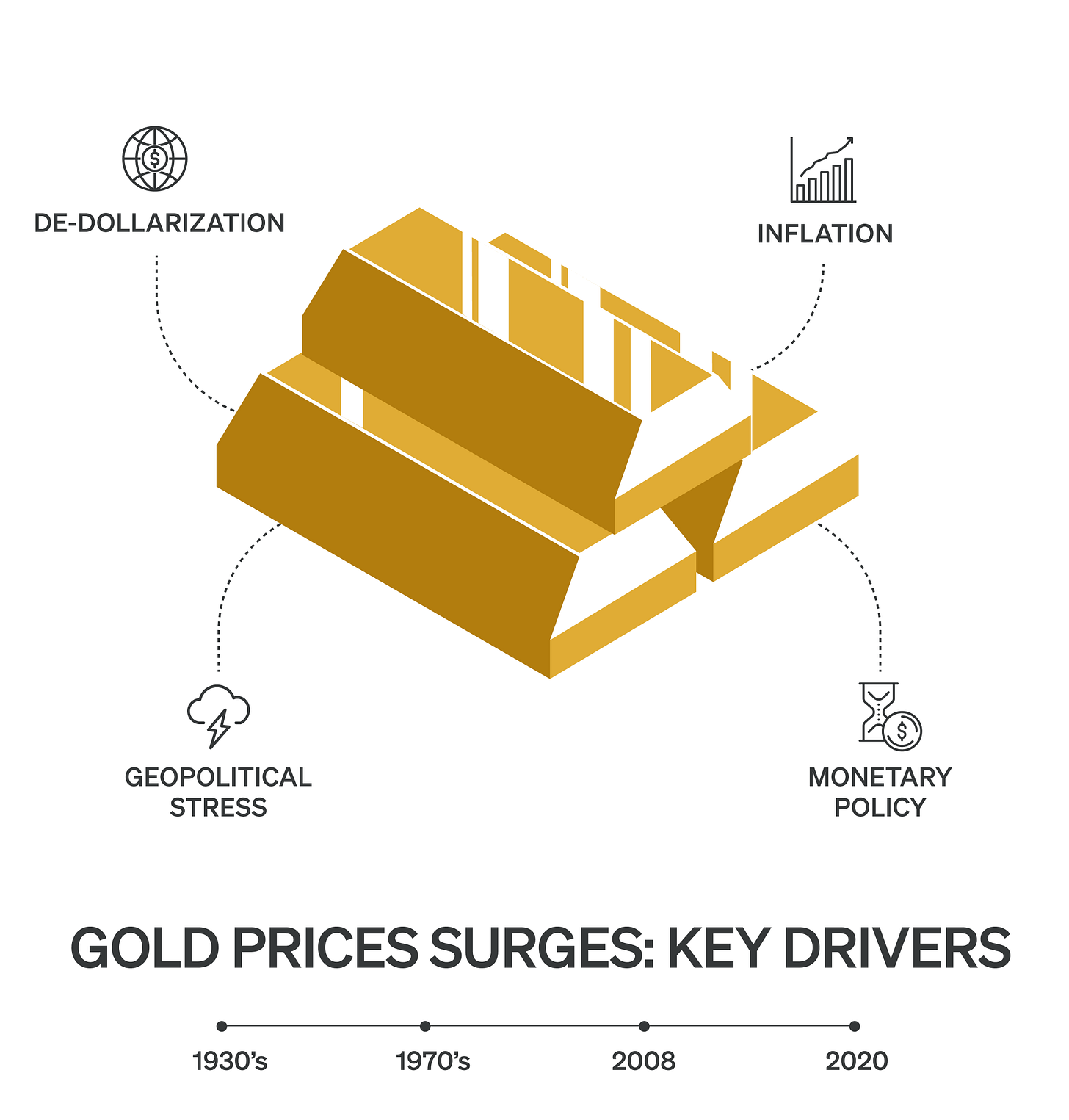 Over the last century, gold has gone through several major price surges—often followed by periods of correction or stability. They’ve never been random and have almost always been triggered by a mix of four key factors, like we discussed earlier.