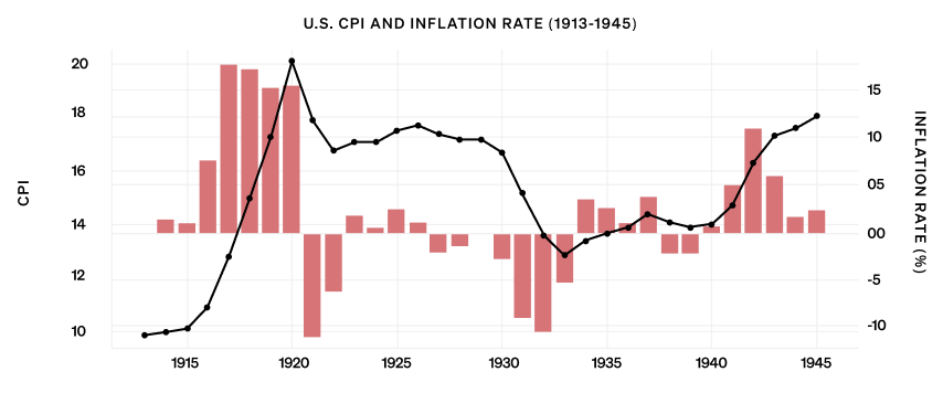 At the time, the U.S. was stuck on the gold standard: each dollar was backed by gold, limiting how much money the government could print. This made it impossible to stimulate the economy — no room for deficit spending or monetary expansion. In 1933, President Roosevelt ended domestic gold convertibility — citizens could no longer exchange dollars for gold or legally own it in large amounts. Then in 1934, the U.S. officially raised the price of gold from $20.67 to $35 per ounce — a 67% dollar devaluation. This allowed the government to print more dollars per ounce of gold, injecting more money into the economy. This was the turning point — it marked a clear policy break from past orthodoxy, giving rise to modern fiat monetary tools.Sticky or Rising Inflation— but not by accident: