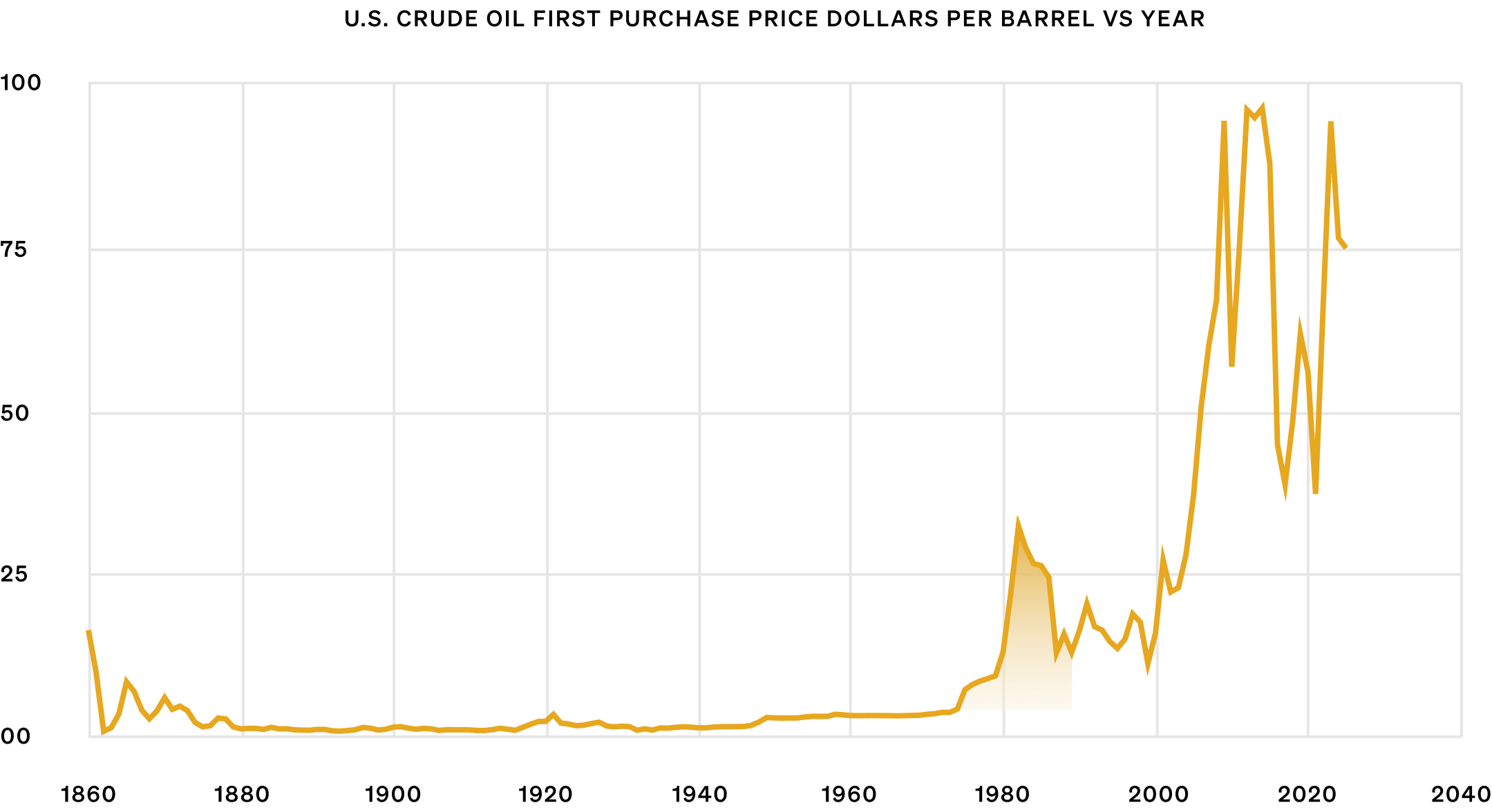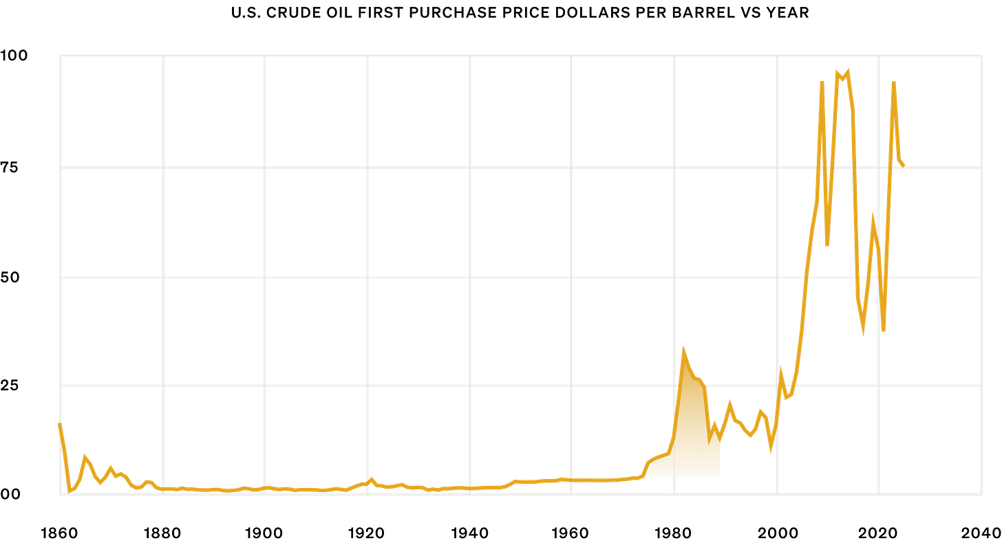 1973 Yom Kippur War (October 6–25, 1973): This war in the Middle East led OPEC countries to stop exporting oil to several Western nations. As a result, oil prices (WTI crude) jumped from about $3.50 per barrel to more than $12 per barrel by early 1974 — almost a 300 percent rise.