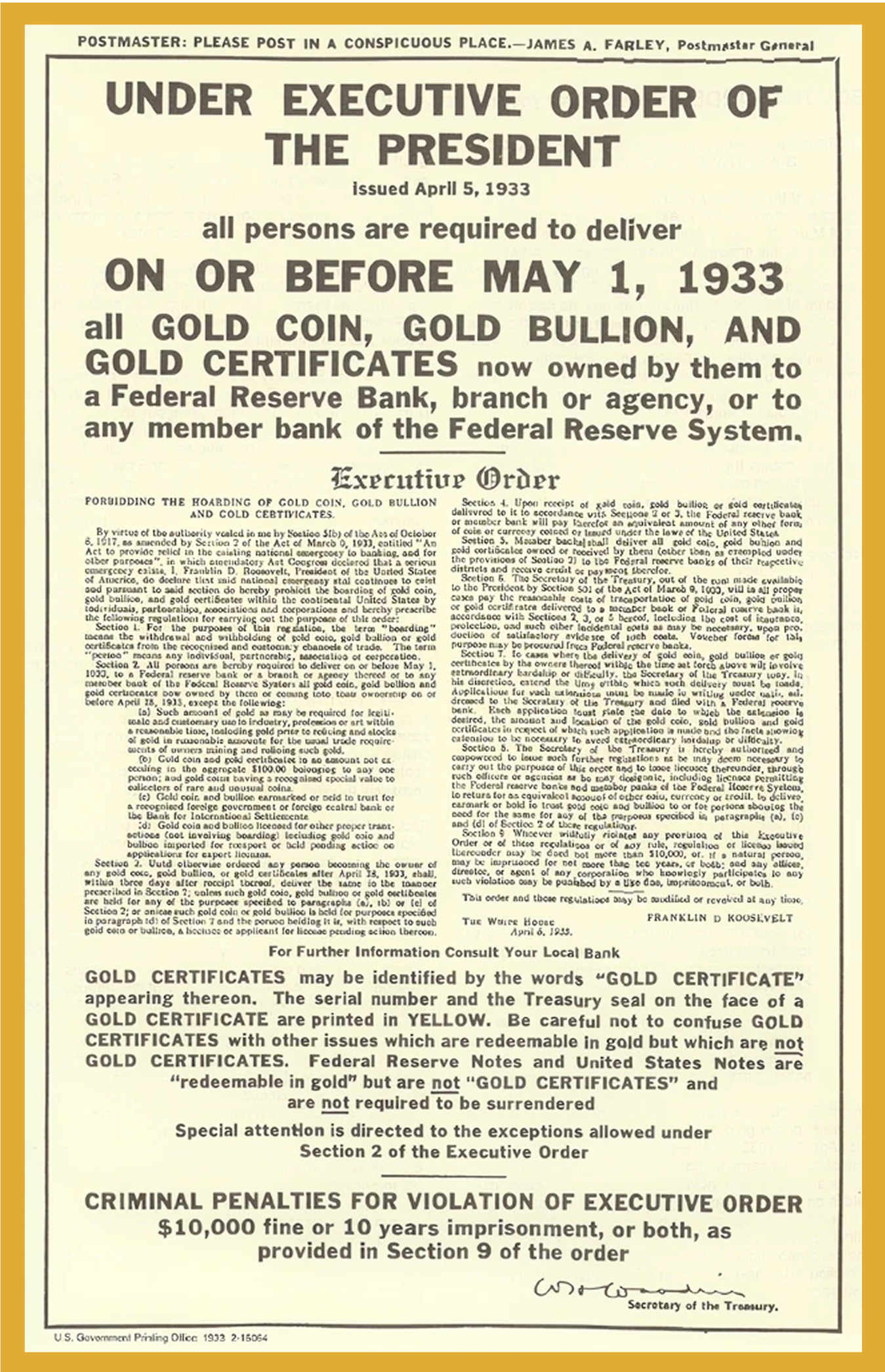 So, in 1933, President Franklin D. Roosevelt took a bold step. He ended the gold standard, banned private ownership of gold, and devalued the U.S. dollar by raising the official gold price from $20.67 to $35/oz.