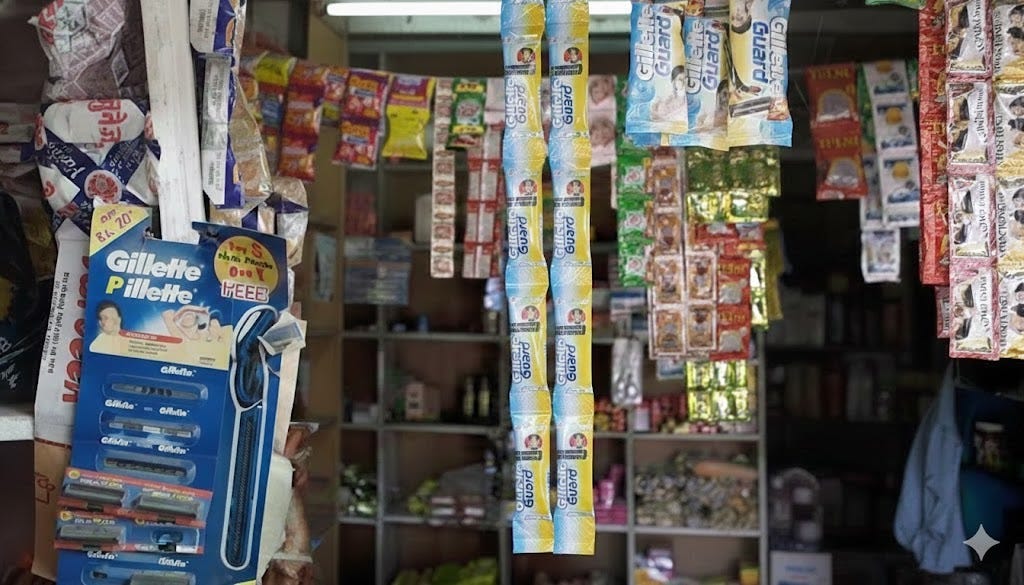 In India, a large share of refill purchases happen in small neighbourhood stores. These kirana shops are where many people buy blades regularly. If a brand is consistently available in these stores, it gains a clear advantage. When the customer walks in, Gillette is already on the shelf.